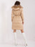 Der Steppmantel mit Kapuze, Pelzumrandung und Gürtel ist in den Größen S-XL erhältlich.
